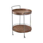 Carro bar com estrutura metálica, bandejas em madeira e rodízios, elegante e funcional.