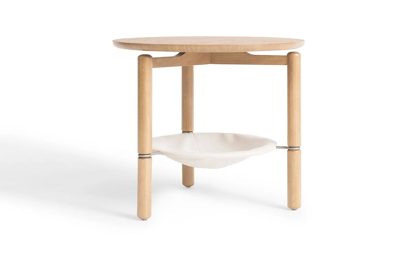 Mesa lateral pés madeira tingida ou pintada. Tampos laminados ou vidro pintado. Suporte inferior em aço carbono pintado com detalhe em couro.